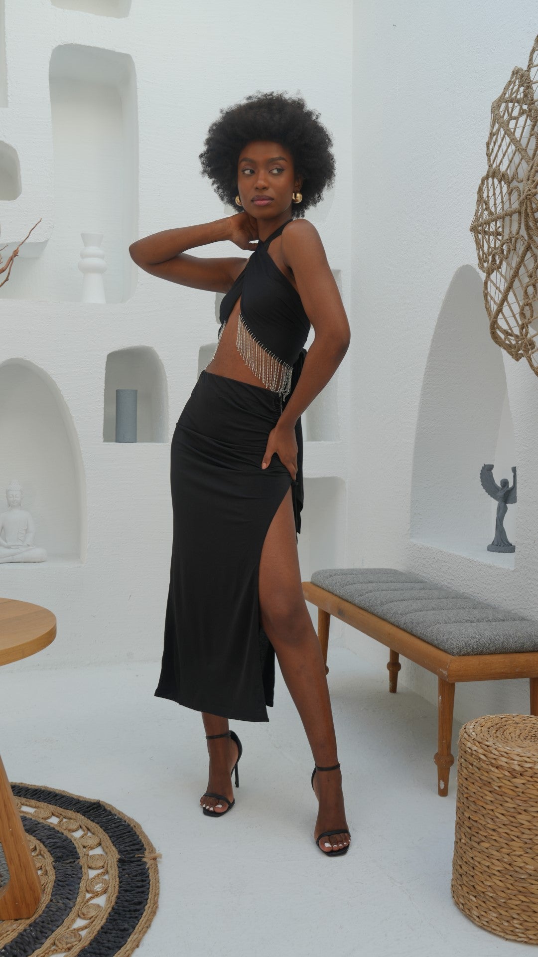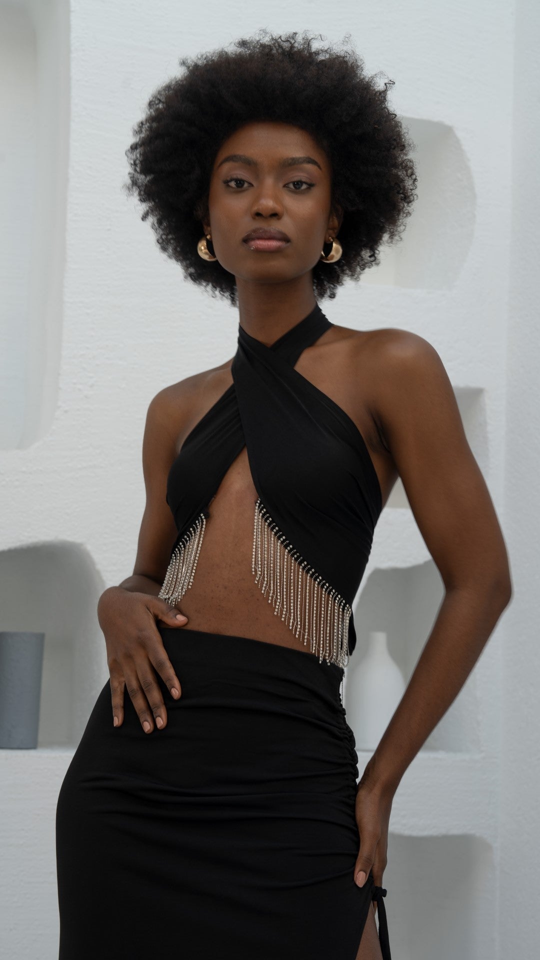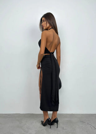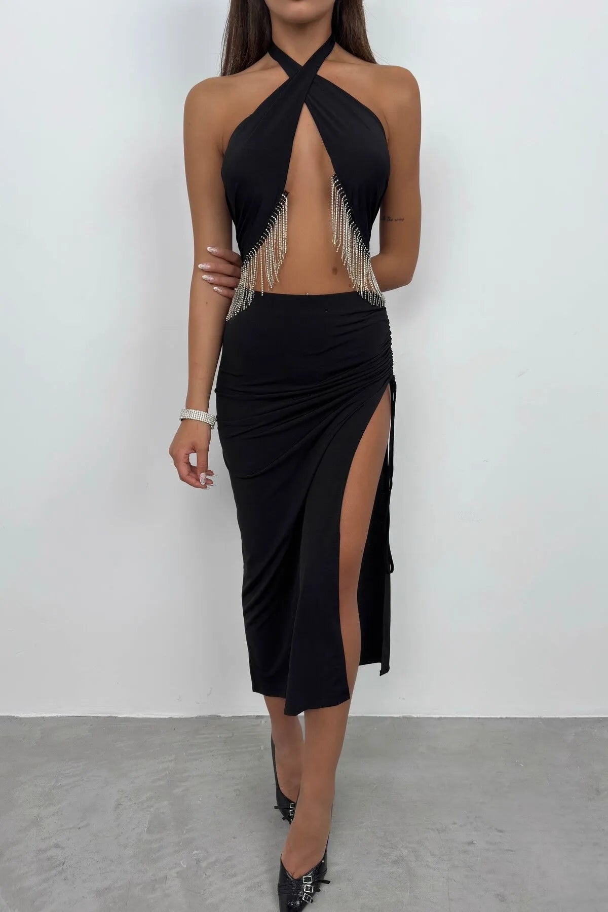 Cet ensemble audacieu, d'une élégance incontestée, présente un design halter unique avec un décolleté plongeant souligné par des détails de chaîne scintillants, évoquant un ciel nocturne parsemé d'étoiles. La fente latérale révèle juste ce qu'il faut de peau, tandis que le tissu drapé flattera votre silhouette en toute occasion, des diners raffinés aux soirées de gala.