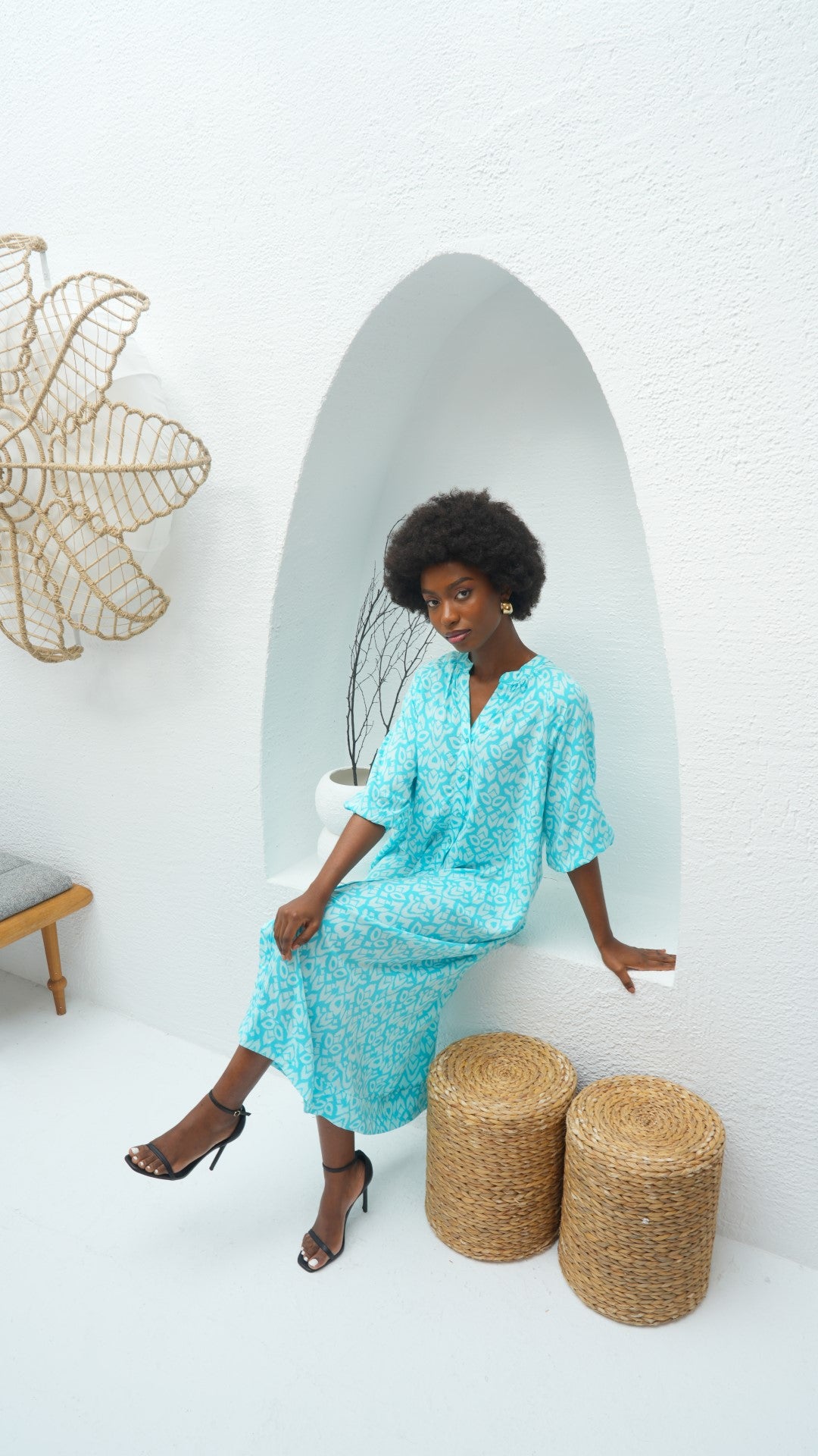 Cette robe offre une sensation de légèreté et de fluidité. La coupe longue et le décolleté en V sont équilibrés par des manches trois-quarts, créant une silhouette à la fois moderne et intemporelle. Le tissu doux et respirant fait de cette pièce un choix idéal pour les jours ensoleillés, tandis que la fente avant ajoute une touche de sophistication.