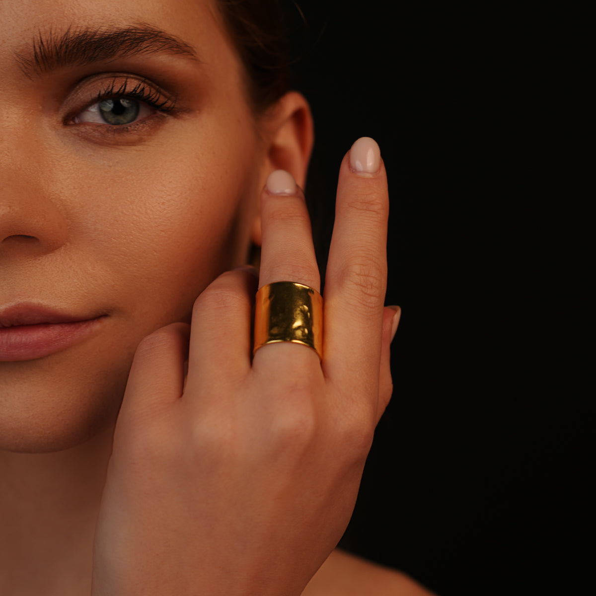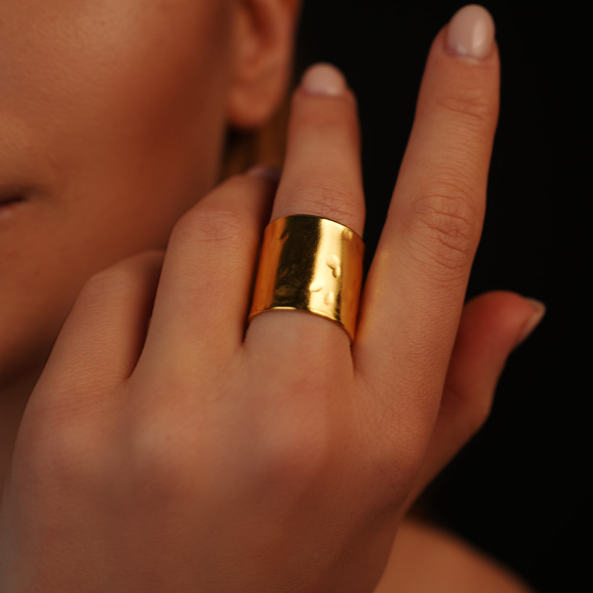 Description: Le modèle "Glided" est une pièce qui attire l'attention par son élégance et son aspect accrocheur. Le placage à l'or ajoute un aspect élégant à la bague et crée une sensation de luxe. Le métal en laiton assure une utilisation confortable de la bague avec sa structure durable et légère. Ce design spécial est un accessoire accrocheur qui attirera l'attention sur vous à la fois au quotidien et lors d'événements spéciaux.