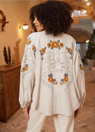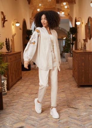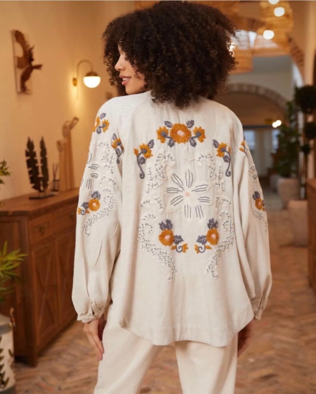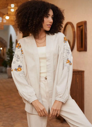 Enveloppez-vous de douceur et d'élégance avec notre kimono orné de délicates broderies florales. Chaque détail est pensé pour apporter une touche de féminité et de beauté naturelle à votre style.