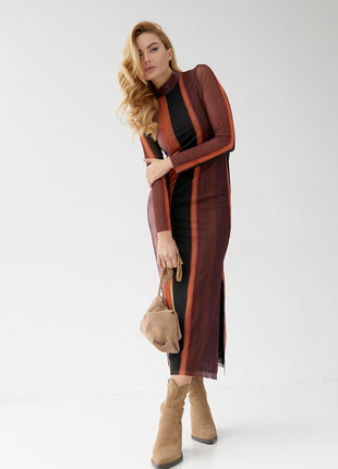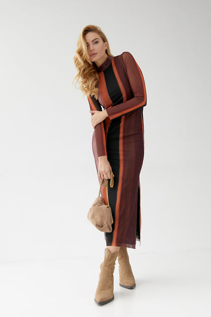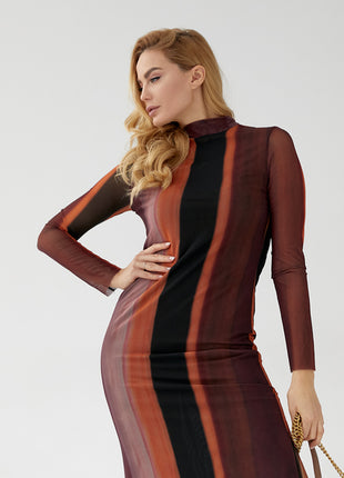 Inspirée par les teintes automnales, notre robe est une célébration des couleurs chaudes de la nature. Avec ses lignes fluides et son motif abstrait, cette robe est une interprétation moderne de l'élégance classique. Son tissu translucide superposé crée un effet de profondeur et de mouvement, capturant l'essence de la sophistication discrète.